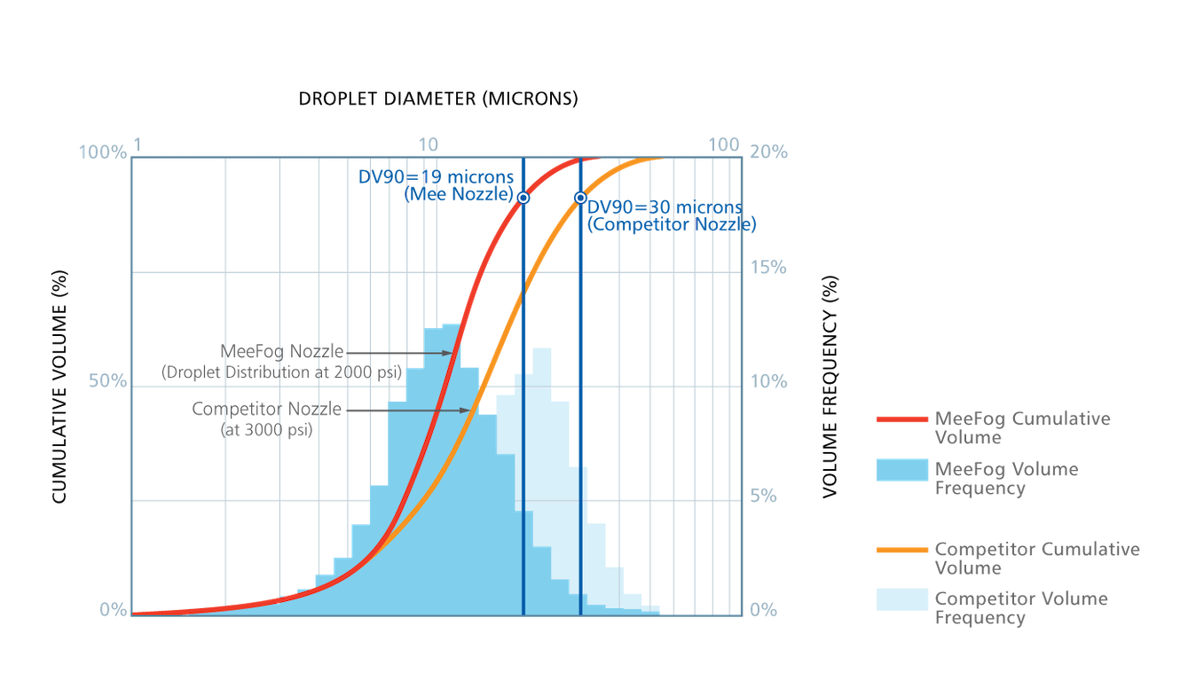 With an operating pressure of 2000 psi, MeeFog nozzles produce droplets under 10 micrometers—finer than a strand of human hair—for maximum efficiency and misting precision.