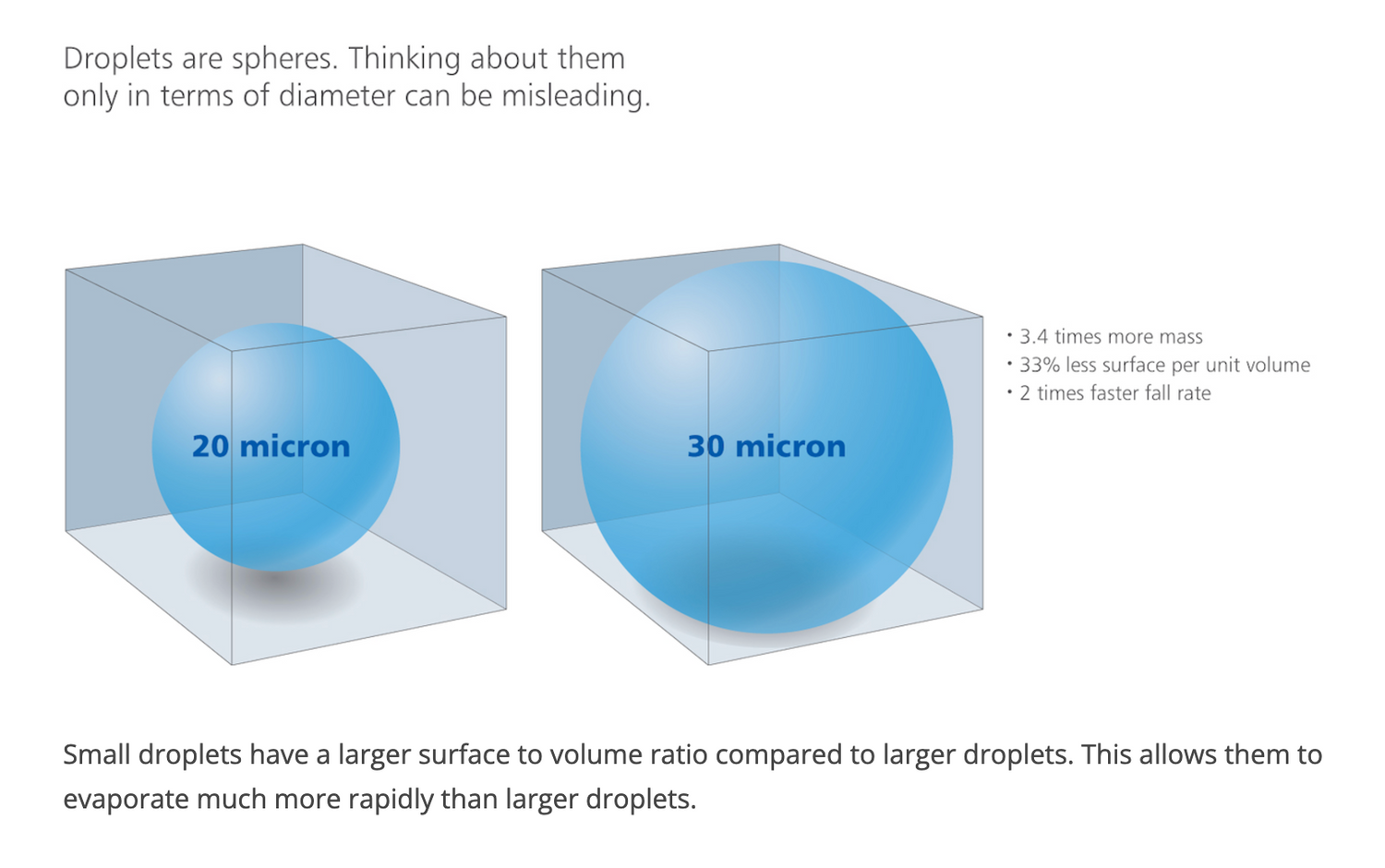 Small droplets have a larger surface to volume ratio compared to larger droplets. This allows them to evaporate much more rapidly than larger droplets.